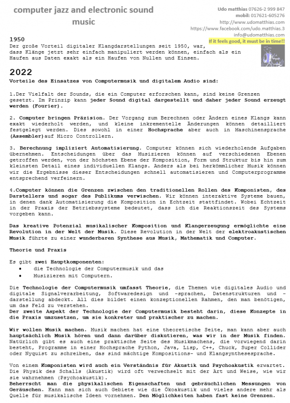 afrikanische Musik, Jazz, Grains und Improvisationsmusik. Explaining Sound-Shapes. Meine Musik ist grenzüberschreitend. Ich verarbeite Mathematik, Spiel- und Chaostheorie, Jazz- und Blueselemente, elektronische Klangmusik, akusmatische Musik, Musik aus Afrika, Samples, eigene Software, eigene Elektronik. Ich programmiere eigene Instrumente und kreiere eigene Sounds. Die interaktive Arbeit Mensch Maschine beschäftigt mich seit mehr als 30 Jahren. Ich liebe die Verwendung und den freien Zugriff auf alle Klänge (Sounds) gepaart mit Handwerk. Die Kunst der Musik ist für mich nicht begrenzt auf Modelle von Instrumenten und Stimme.