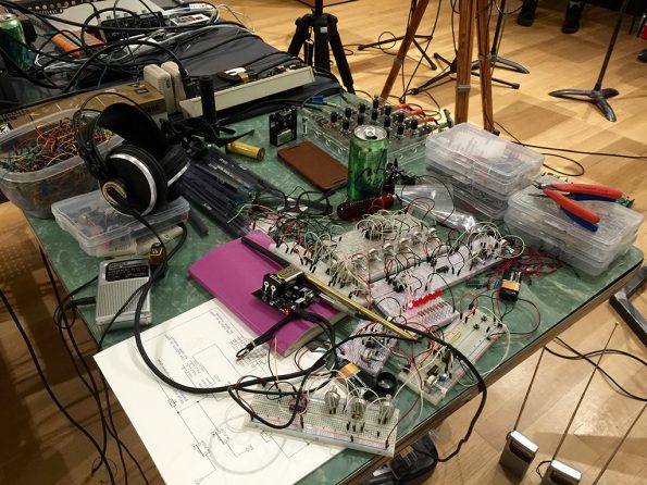 12Wie Driscoll erklärt, verwendete Tudor in den frühen Iterationen des Stücks kleine Objekte auf einer Tischplatte und spezielle selbstgebaute Elektronik mit Feedback-Oszillatoren. „Die akustische Ausgabe dieser kleinen Objekte war nicht sehr laut, aber das Signal, das an die Lautsprecher gesendet wurde, war ziemlich laut“, sodass die Zuhörer über das Lautsprechersystem hörten, anstatt das Objekt selbst zu hören. (Driscoll, Skype-Gespräch – 25.03.2019).