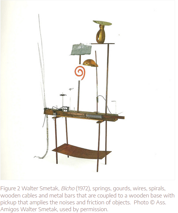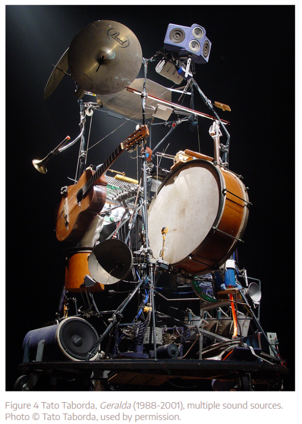 Der populäre brasilianische Ausdruck Gambiarra beschreibt eine improvisierte, informelle Art, ein alltägliches Problem zu lösen, wenn benötigte Werkzeuge oder Ressourcen nicht verfügbar sind. Wie „Hacking“ und „DIY“ spiegelt es eine Art des Umgangs mit Gegenständen und Themen wider, die das tägliche Leben postindustrieller Gesellschaften beschäftigen, aber Gambiarra bezeichnet auch spezifische Aspekte der brasilianischen Kultur. Bei der Anwendung auf bildende Kunst, Musik, Klangkunst und Medienaktivismus beschreibt es, wie einige Künstler mit Materialien, Technologie und/oder lokalen Institutionen arbeiten. Zu den Aktivitäten, die Gambiarra-Ansätze widerspiegeln, gehören der Instrumentenbau, das Hacken von Hardware, gecrackte Medien und andere Formen des technologischen Aktivismus > – die alle auf eine Neuinterpretation des Musikinstruments hindeuten.
