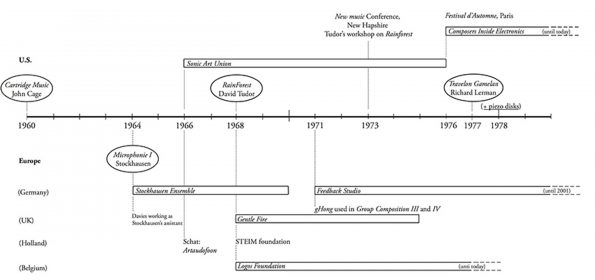 Die beschriebenen vielfältigen Erfahrungen eint das gemeinsame Interesse an den Möglichkeiten der Verstärkung und an neuen Formen des Klangerlebens durch den Einsatz von Kontaktmikrofonen.Die 1960er, 70er und 80er Jahre waren eine Zeit der regen Verbreitung von Ideen. Lange bevor das Internet diese Art des Teilens mühelos machte, boten internationale Festivals und Konzerte Gelegenheiten für Musiker, sich zu treffen und ihre Arbeit und technische Forschung auszutauschen.Amerikanische Komponisten reisten durch ganz Europa und brachten neue Ideen aus der Neuen Welt mit. Cage und Tudor gehörten zu den frühesten und hatten eine tiefgreifende Wirkung.Insbesondere Tudor fungierte als Brücke zwischen amerikanischen und europäischen Gemeinschaften. Ab den 1950er Jahren hat er Werke von Komponisten wie Stockhausen, Maderna und Boulez uraufgeführt und dabei starke Verbindungen zur europäischen Avantgarde aufgebaut. Gleichzeitig tourte er oft mit Cage und stellte auch neue Musik anderer amerikanischer Komponisten vor. Es ist erwähnenswert, dass die Uraufführung von Cartridge Music in Deutschland (mit Stockhausen im Publikum) im Kölner Atelier von Mary Bauermeister am 6. Oktober 1960 stattfand.