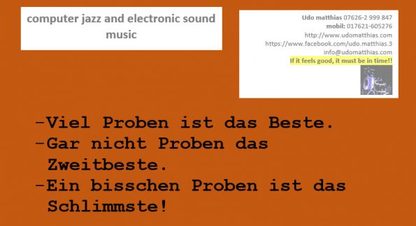 In recent years, Udo Matthias has been playing with many different names, including Chris Weller, Wilfrid Kirner, Lukas Heideprim, Axel Fischbacher, Ingmar Winkler, Peter Wagner Organ (CH), André Buser Bass (ch), Stefan Stalf (Munich), Johnny Gomer (guit), u.v.a. For several years he has been working on his own project @frigal – electronic music with African rhythms. Udo Matthias spielte in den Letzten Jahren unter immer wieder anderem Namen mit vielen verschiedenen Musikern (Chris Weller, Wilfrid Kirner, Lukas Heideprim, Axel Fischbacher, Ingmar Winkler, Peter Wagner organ (CH), André Buser bass (CH), Stefan Stalf (München), Johnny Gomer (guit), u.v.a Seit mehreren Jahren arbeitet er an seinem eigenen Projekt @frigal – elektronische Musik mit afrikanischen Rhythmen.