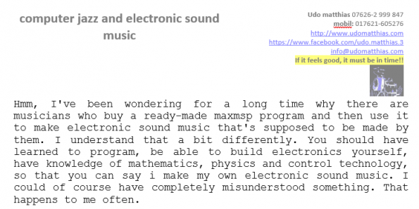 Ich mache (mit Afrigal) elektronische Klangmusik, Electronic Soundmusic. Sound heißt nicht nur Klang, es heißt auch „heil“.  Für alle Musik, sei sie nun