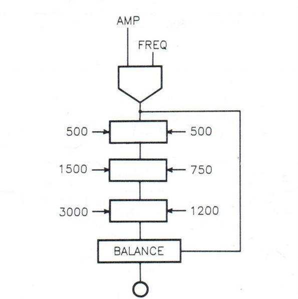 Die Abb. oben enthält ein Beispiel für die nicht standardmäßige Verwendung einer Balance-Funktion. Die drei Bandpassfilter sind in üblicher Weise in Kaskade geschaltet und dienen dazu, dem Signal Resonanzen bei den Mittenfrequenzen von 500, 1500 und 3000 Hz zu verleihen.